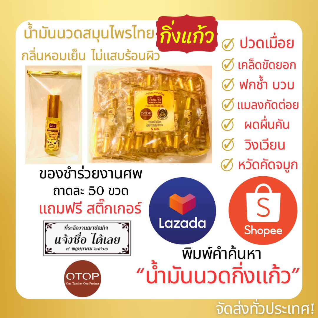 จัดส่งทั่วประเทศ! สั่งซื้อได้ที่ Lazada Shopee พิมพ์คำค้นหาว่า "น้ำมันนวดกิ่งแก้ว" น้ำมันนวดสมุนไพร กิ่งแก้วเฮิร์บ ยาหม่อง Otop 泰式草药按摩油 Thai herbal massage liniment aroma oil. ผลิตจากสมุนไพรไทย ใช้ทาถูนวด ปวดเมื่อยกล้ามเนื้อ เส้นตึง แก้เคล็ดขัดยอกฟกช้ำ บวมแดง แมลงสัตว์กัดต่อย ผดผื่นคัน สูดดม วิงเวียน หน้ามืด คัดจมูก เมารถ เมาเรือ กลิ่นหอมเย็นชื่นใจ ไม่แสบร้อนผิว รับทำ ของชำร่วยงานบุญ ของชำร่วยงานศพ ของชำร่วยงานบวชอุปสมบท ของที่ระลึกในงานพิธีต่างๆจัดส่งทั่วประเทศ Kingkaew Thai herbal massage oil. Used to apply and massage to relieve pain and stiffness, reduce inflammation of muscles and tendons. Relieves knee pain, leg pain, headaches, migraines, dizziness, trigger finger, foot pain, bruises from impacts. Apply before and after exercise to help reduce aches and cramps. Protects against insects and treats venom from insect bites. Has a cool scent of herbs and mint oil. Gives a cool feeling after applying. The oil is not sticky. Otop Product of Thailand.